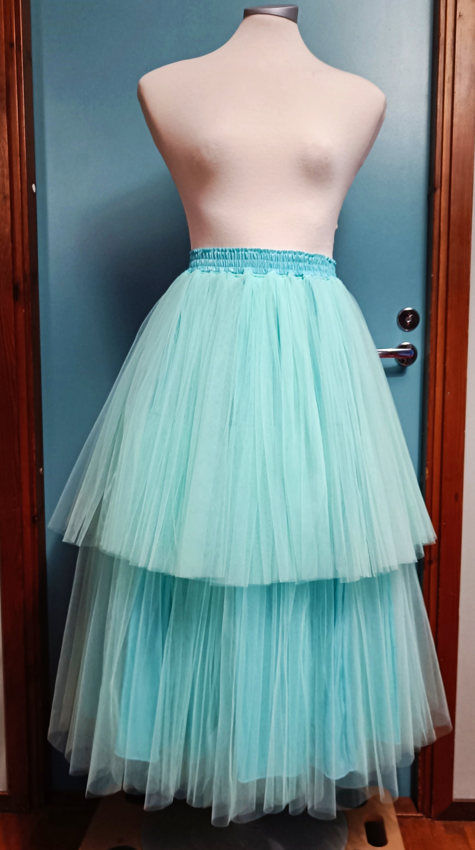 Tyllistynyt-hameessa on kauniisti laskeutuva kerros helma, joka heilahtelee ihanasti liikkeen mukana.